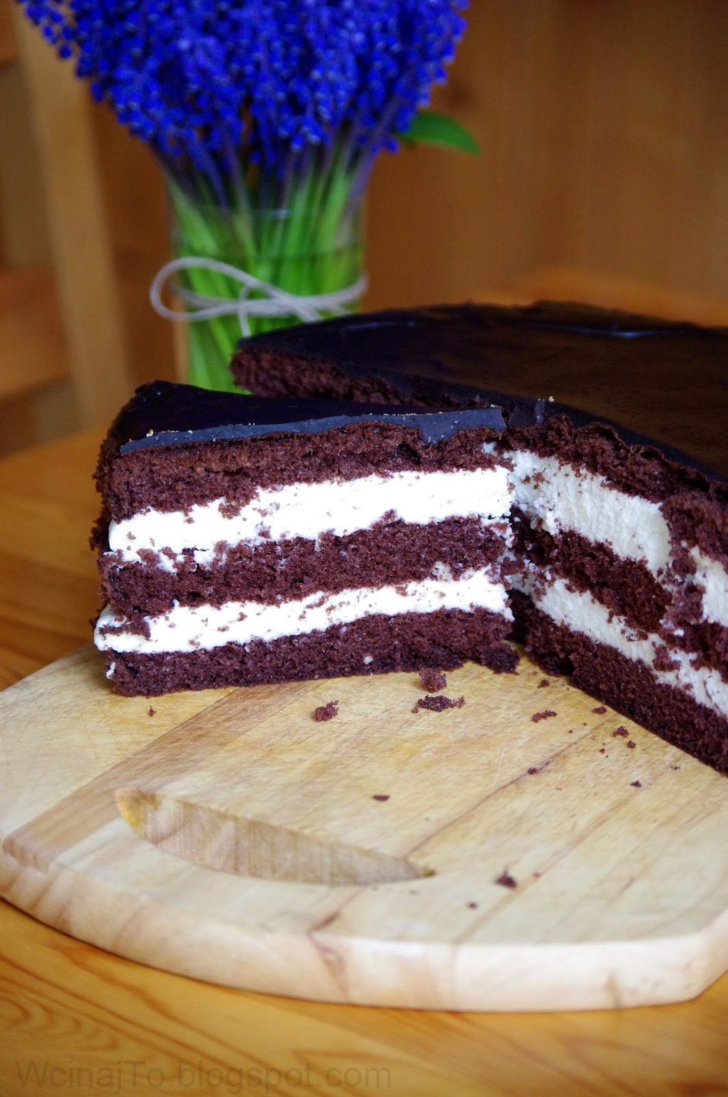 Na pierwszy ogień idzie tort kakaowo-miętowy. Na przepis czekałam prawie trzy lata, w końcu go dostałam, ciasto raz upiekłam i... kartkę zgubiłam ;). Musiałam improwizować, ale wyszło bardzo smacznie. W trakcie przekładania biszkoptów kremem uświadomiłam sobie, że do środka powinna pójść warstwa z herbatników (których oczywiście nie kupiłam). Na sklep nie było czasu, masa z żelatyną już tężała, więc... jest jak jest ;). Tort jest PRZEPYSZNY, lekki, rześki i pachnący miętą. Najlepiej smakowałby polany czekoladą, ja zrobiłam jednak polewę, która nie zostawia śladów na paluszkach i nigdy nie robi się matowa.