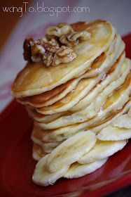 Z przepisu wychodzi około 13 pachnących bananem, mięciutkich placków. Uwaga, poczekać aż ostygną, owoce są po smażeniu bardzo gorące, można się porządnie poparzyć! Swoje zjadłam z dodatkową porcją bananów, a na wierzchu położyłam dwie łyżeczki orzechów włoskich w miodzie, mniam :).