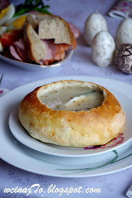 Przedstawiam Wam zatem włoskie miseczki chlebowe (przepis znalazłam u Dorotus). Prezentują się moim zdaniem całkiem ciekawie, na pewno lepiej niż nudny talerz wypełniony zupą. Dorotus poleca napełnianie ich gęstymi zupami, ale biały barszcz też będzie ok. Miseczki nie przemakają szybko - u mnie nie przeciekały wcale, ale może to kwestia tempa jedzenia ;-)). Jak dla mnie jedyną ich wadą jest... smak. Niestety, zupełnie nie dla mnie, ale spodziewałam się tego, że mają pełnić funkcję głównie ozdobną.