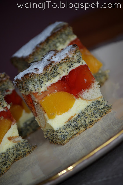 okrągłe biszkoptyBiałka ubić i dodać cukier, żółtka, mąkę, proszek do pieczenia i mak (piec 45 min.). Po upieczeniu ciasto przekroić na pół, rozprowadzić połowę kremu, ułożyć biszkopty pionowo. Między biszkoptami ułożyć pokrojone brzoskwinie, następnie zalać tężejącą galaretką wiśniową. Posmarować resztą kremu i położyć drugą część biszkoptu.